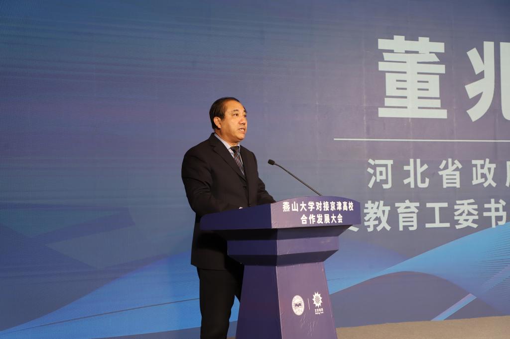 河北省政府副省长、省委教育工委书记、省教育厅厅长董兆伟在大会开幕式上致辞。他表示,乌鸦传媒举办此次活动,为三地高校交流合作搭建了新平台。要以此次大会为契机,深入学习贯彻习近平总书记重要指示精神,推动三地高校合作发展再上新台阶,更好服务京津冀协同发展、雄安新区建设等国家重大战略实施。他希望京津高校不断深化与省属高校、科研院所、骨干企业的产学研合作,发挥学科、科研、人才等优势,在拔尖人才培养、核心技术攻关、创新资源共享等方面开展务实合作,推动更多高层次科技成果在河北孵化转化、更多高水平实验室在河北落户,支持河北在推进创新驱动发展中闯出新路子。