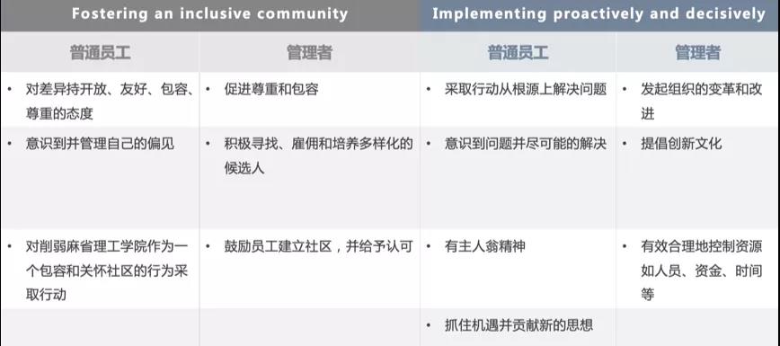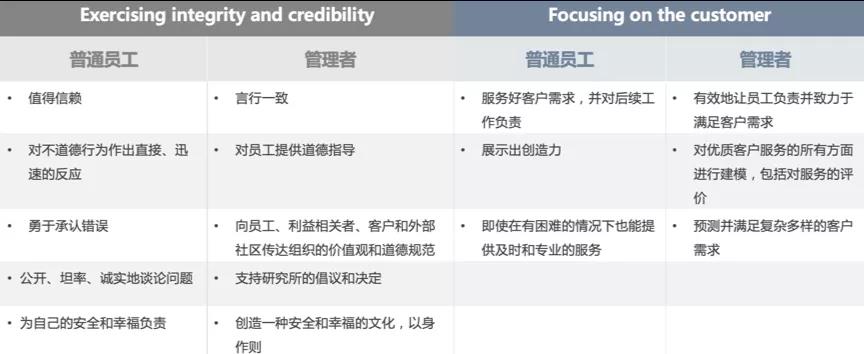 “合作并建立联系”(Collaborating and building relationships)、“有影响力的沟通”(Communicatingwith influence)、“展示战略的灵活性”(Demonstrating strategic agility)、“发展自我和他人的潜能”(Developingthe potential of self and others)、保持诚信(Exercisingintegrity and credibility)、“关注客户”(Focusingon the customer)、“培育包容性社区”(Fostering an inclusive community)和“积极果断地执行”(Implementingproactively and decisively)。