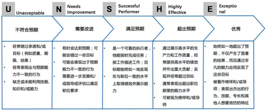 §超出预期(Exceeds Expectations),是指职员的绩效始终达到并经常超过所有目标和期望,产生超过预期的结果,同时表现出在能力期望之外的行为,取得组织认可的贡献。