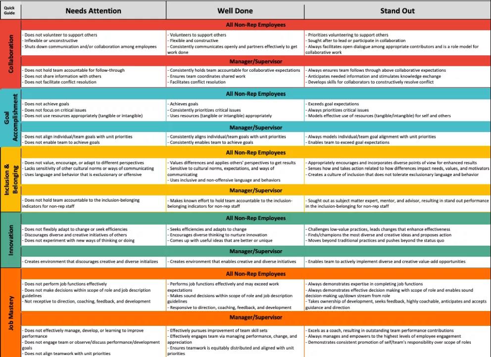 伯克利为职员的每个考核指标定义了不同等级的行为标准,如下图所示,总体分为“需要注意”(NeedsAttention)、“做得好”(Well Done)和“优秀”(StandOut)。