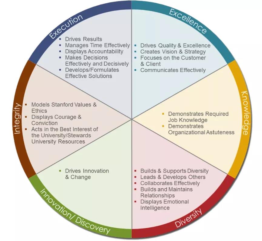 如下图所示,斯坦福大学职员胜任力指标主要包括:执行力(Execution)、卓越(Excellence)、知识(Knowledge)、多样性(Diversity)、创新/发现(Innovation/Discovery)和正直(Integrity)。