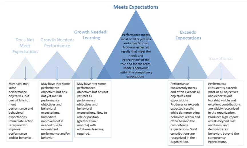 §满足预期(Meets Expectations),是指职员的绩效符合大多数或所有目标和期望,在能力期望范围内产生符合角色和团队期望的预期结果。