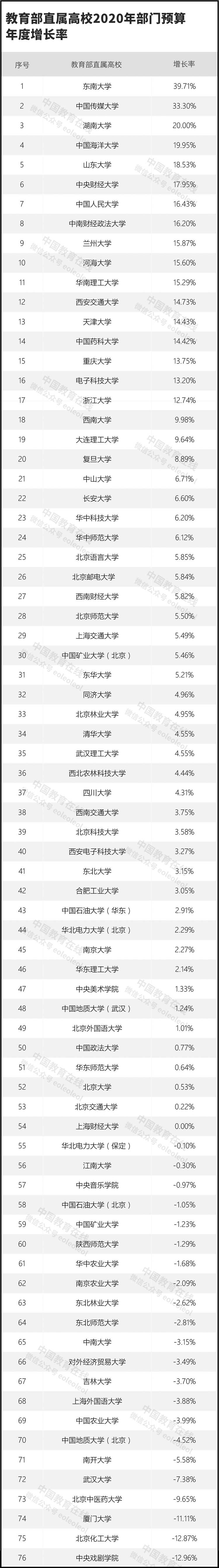 而增长率较高的学校为东南大学、中国传媒大学、湖南大学。这些高校预算经费增长率都超过20%。14所高校增长率在10-20%之间。另外,有36所高校经费有所增长,但增长率在10%以下。