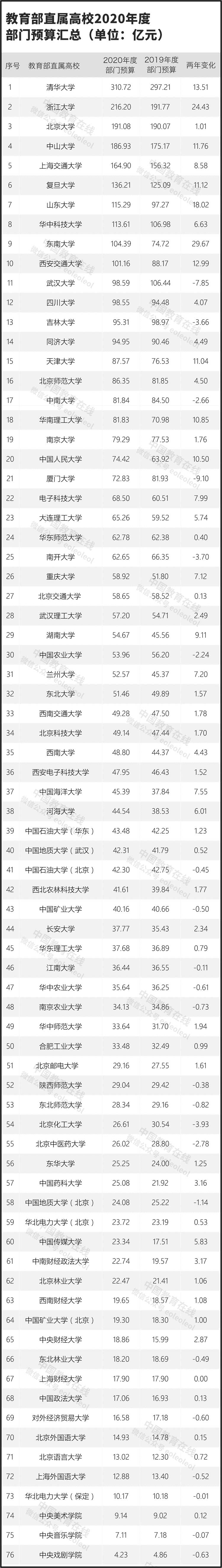 2020年6月11日,教育部率先在其官网公布了其2020年度经费预算。根据教育部《关于部属高校公开部门预算的通知》要求,教育部直属高校均应在一定期间内公布其经费预算,以回应社会关切。根据教育部直属高校公布的预算经费,我们可以对76所高校“国家队”的经费数量和使用情况有一定了解。